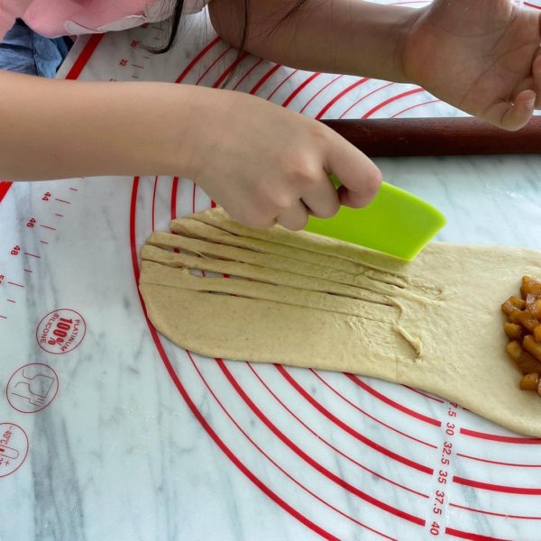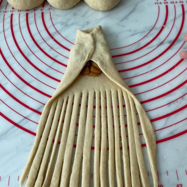 - Add Apple cinnamon on the top ends of the oval and cut the strips at the lower half of the oval. Wrap the Apple cinnamon with the sides of upper oval the and roll it down to the strips side. Pinch to seal the edges. Repeat for the rest and let the shaped dough proof in greased pan till doubled (I’m using 20cm round cake tin)